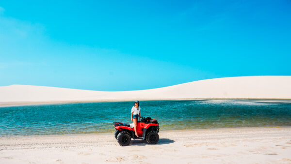Saída de São Luís às 04:00h* com destino a Barreirinhas, e previsão de chegada às 08:00h*. Após a chegada, é realizado o check-in na pousada. A partida para o passeio acontece em veículo 4×4, com um percurso de aproximadamente 1h30min por trilhas, dunas e vegetação até a vila de Atins, com chegada prevista às 10:00h*. O primeiro atrativo é a praia, onde os visitantes podem desfrutar de um banho de mar e observar a prática de kitesurf. Em seguida, o passeio continua até o Canto dos Lençóis, conhecido por suas praias desertas e tranquilas.