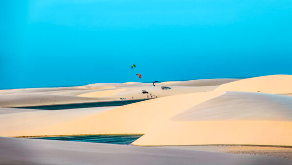 horas. O primeiro atrativo é a praia, onde os visitantes podem desfrutar de um banho de mar e observar a prática de kitesurf. Em seguida, o passeio continua até o Canto dos Lençóis,