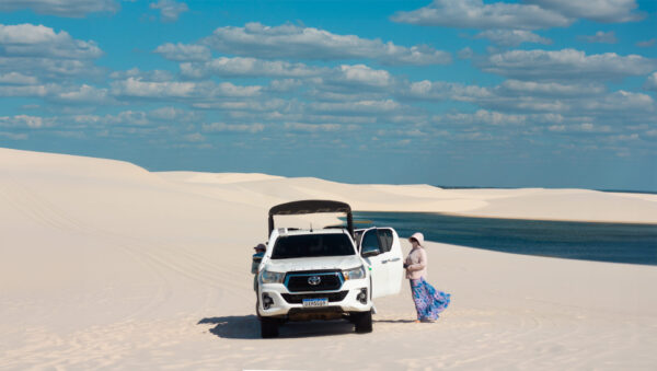 A partida é feita de Barreirinhas em veículo 4×4, com travessia do Rio Preguiças pela ponte e continuidade por trilha até os Grandes Lençóis. No circuito da Lagoa Bonita, as dunas tornam a paisagem deslumbrante e desafiadora, com algumas atingindo até 50 metros de altura. A visitação inclui as lagoas do Maçarico, Clone e Bonita.