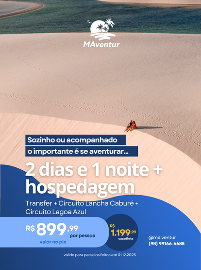 A saída de São Luís ocorre às 08:00h*, com destino a Barreirinhas, e chegada prevista para às 12:00h*. Às 14:00h*, é feito o embarque em veículo 4×4 para atravessar o Rio Preguiças de balsa e seguir por trilhas até os Grandes Lençóis. No circuito da Lagoa Bonita, as imponentes dunas, algumas com até 50 metros de altura, tornam a paisagem deslumbrante e desafiadora. Durante o passeio, os visitantes terão a oportunidade de conhecer as lagoas do Maçarico, Clone e Bonita, com o retorno previsto após o pôr do sol.