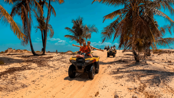 Após o café da manhã, às 09:00h*, ocorre o embarque em quadriciclos, com um breve treinamento e orientações sobre o trajeto e o uso do veículo. Em seguida o passeio inicia com 2 km à beira do asfalto, seguido por trilhas pelo Bosque, até a chegada aos Pequenos Lençóis. Na Lagoa do Alazão, haverá uma parada para banho e uso de atrativos como caiaque e tirolesa. O percurso continua até Caeté, com uma breve pausa para apreciar uma água de coco. Em seguida, o passeio segue até Vassouras, localizada às margens do Rio Preguiças. Passando pelo Morro do Boi, chega-se à Praia de Caburé por volta das 11:00h*, onde é possível desfrutar de um banho de mar e almoço. O retorno a Barreirinhas está previsto para as 15:00h*, com a travessia pela estação eólica. A saída de Barreirinhas com destino a São Luís é às 17:00h*, com previsão de chegada às 21:00h*. A noite é livre para atividades independentes.